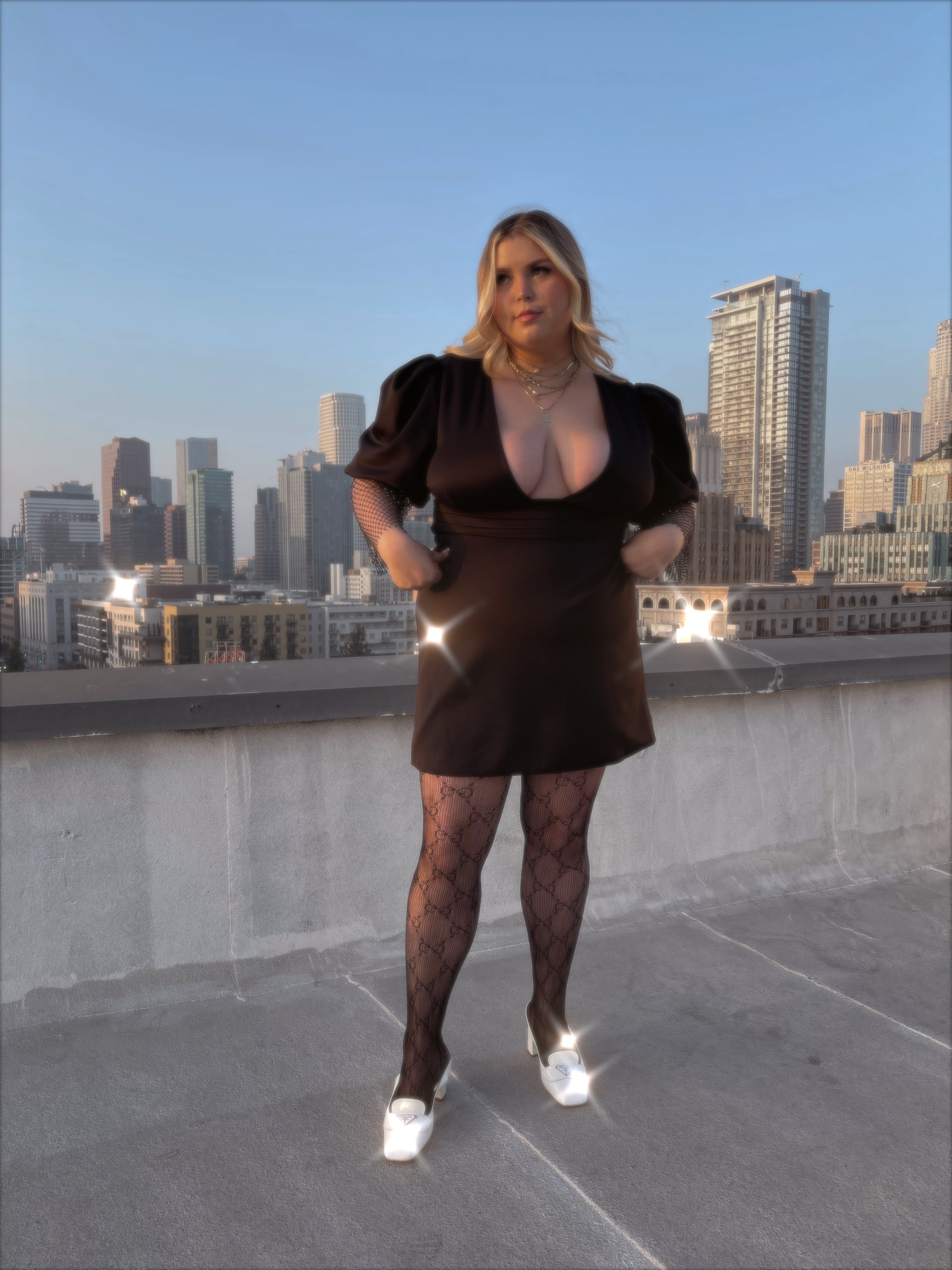 Not your average LDB! It features a plunging neckline and puffed shoulders with ruched detail, exposed open back with self tie ribbon and a pleated waist detail. The sleeves contrast with a RHINESTONE embellished fish net design. Add your fav heels and you'll be sure to make a statement!