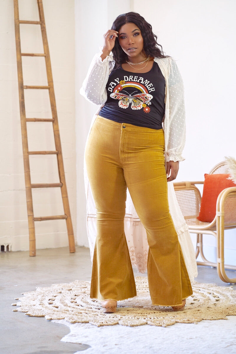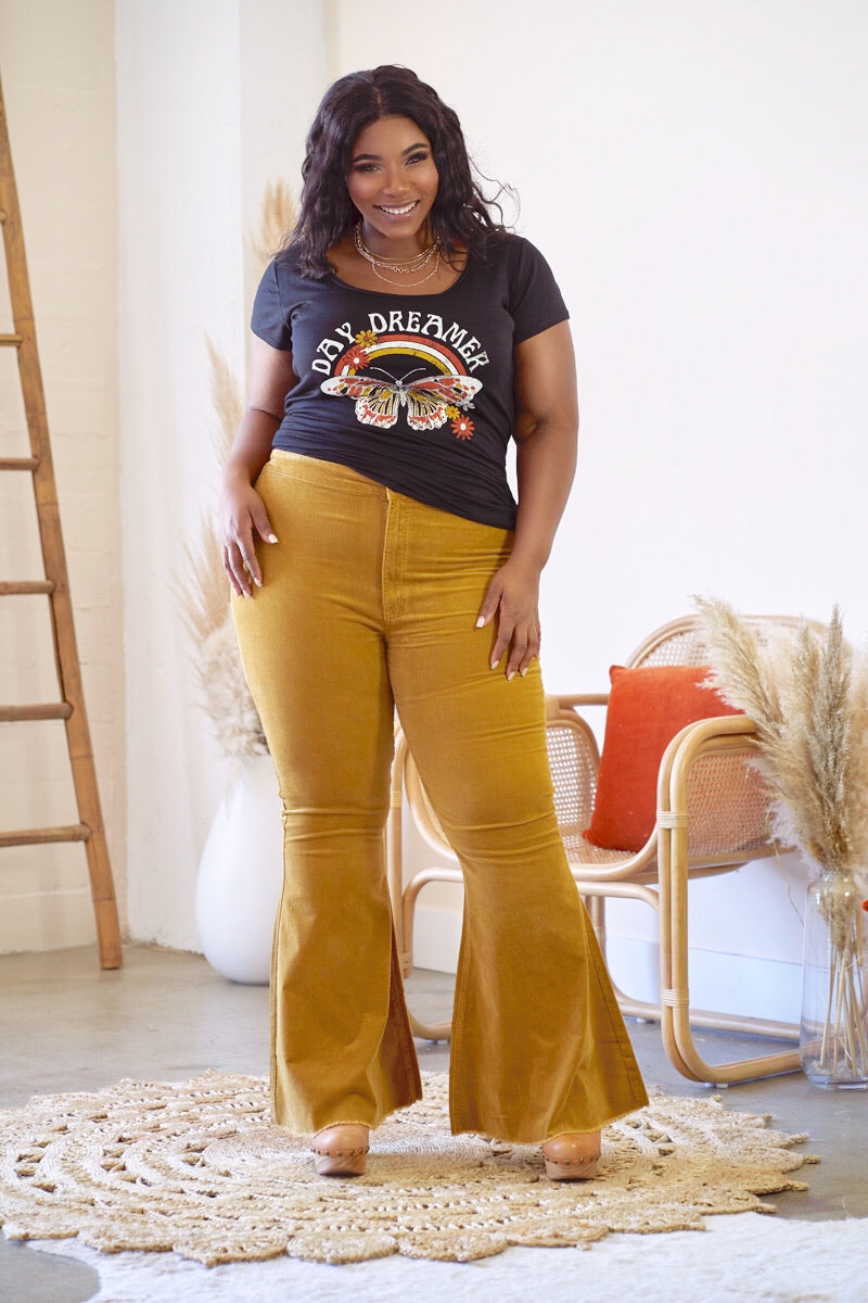 Be a DAY DREAMER in this new tee. Made of ultra soft and thin fabric perfect for summer. Scoop neck line, very stretchy and features a retro print. Pair with any type of denim and your fav sneakers!