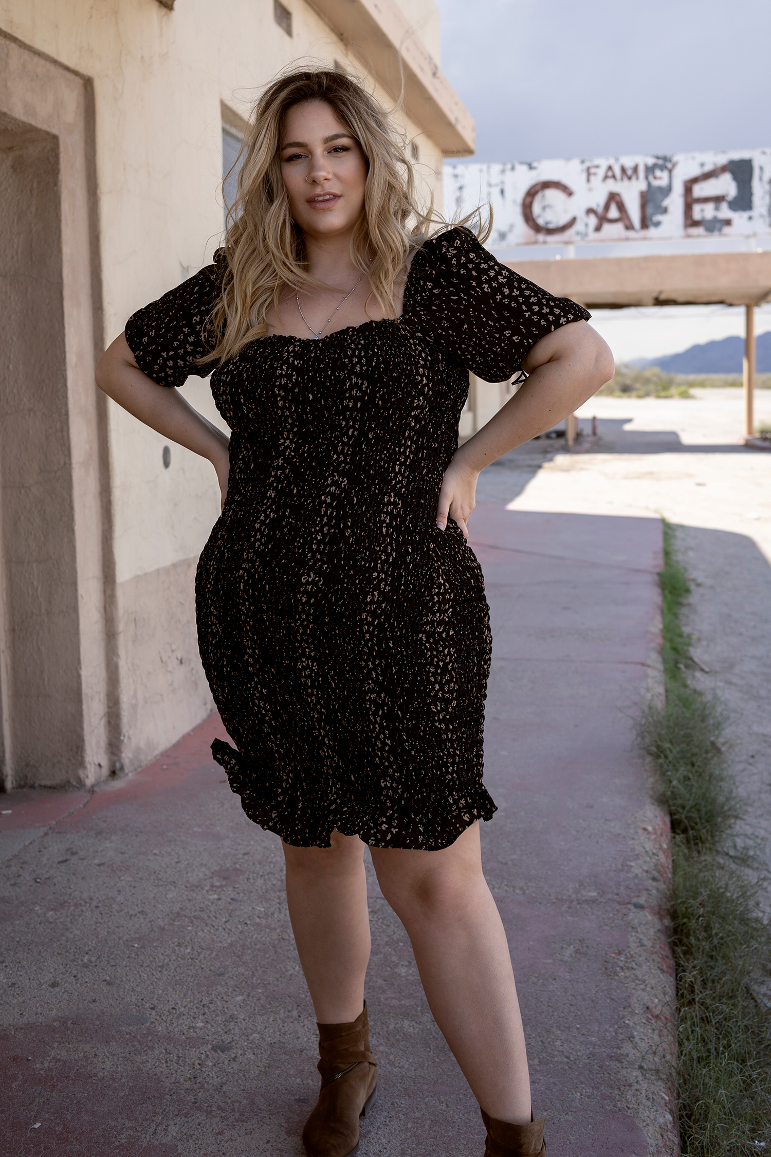 The RUMOR dress has a square neckline and a ruched bodice. Features a stretch bodycon fit, with a ruffle hem and a puff sleeve. Wear it with strappy sandals or booties, it's worth making plans for.