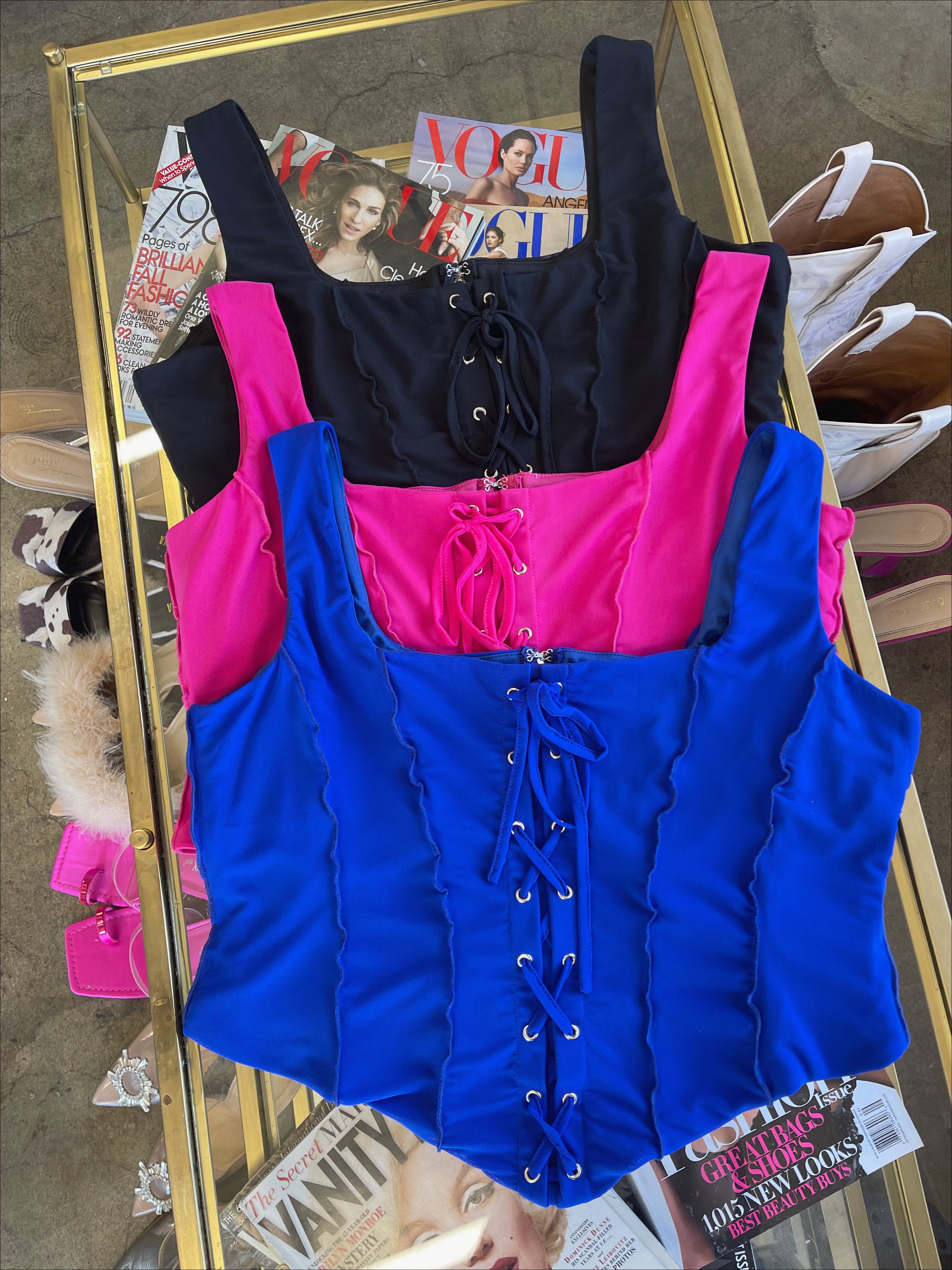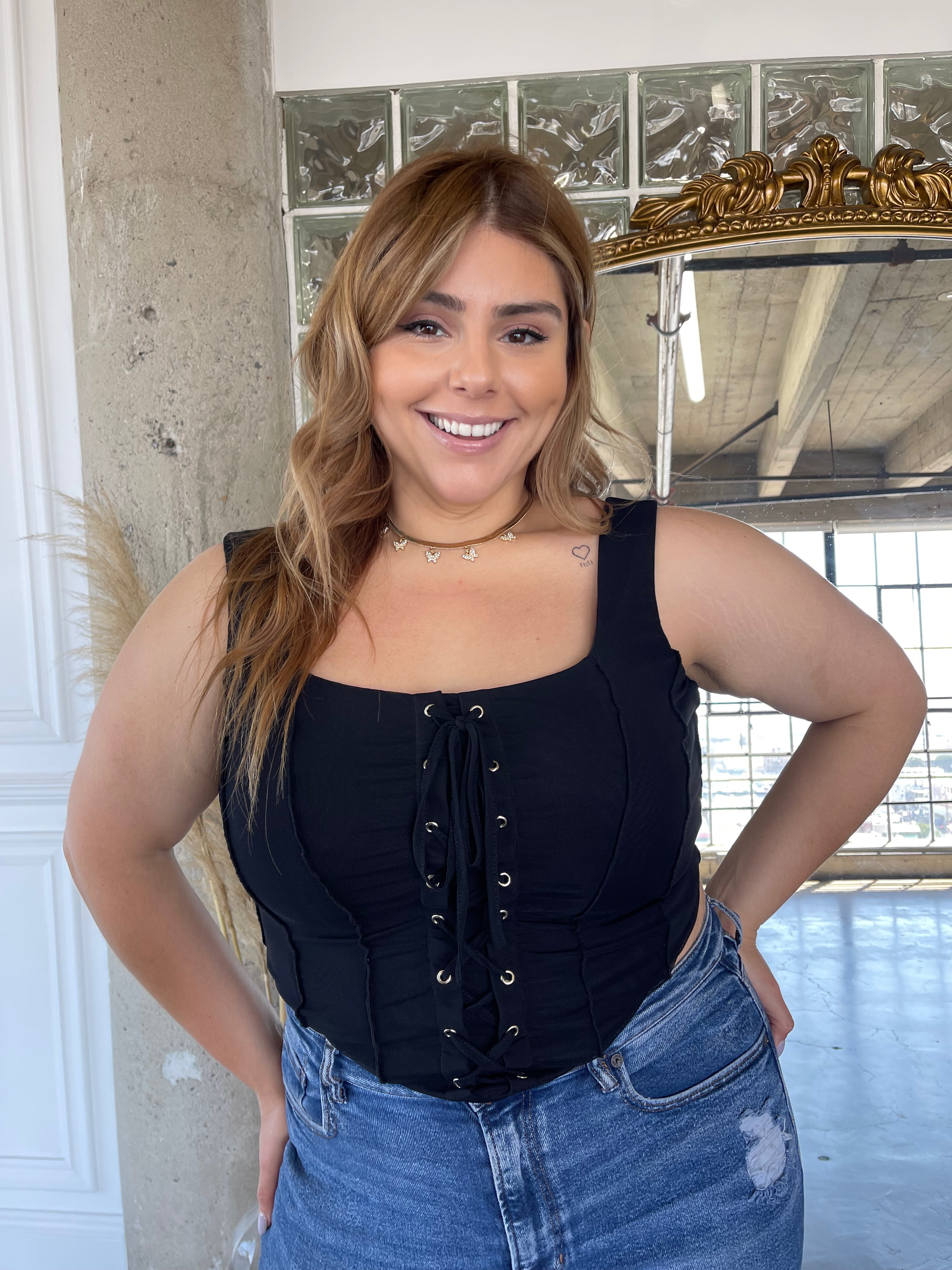 Just in time for Summer, the TAKE ME OUT top is perfect for any day out. Stretchy, double lined and features a faux corset tie in the front. Zipper closure in the back, can be styled with jeans and converse or a mini skirt with heels!