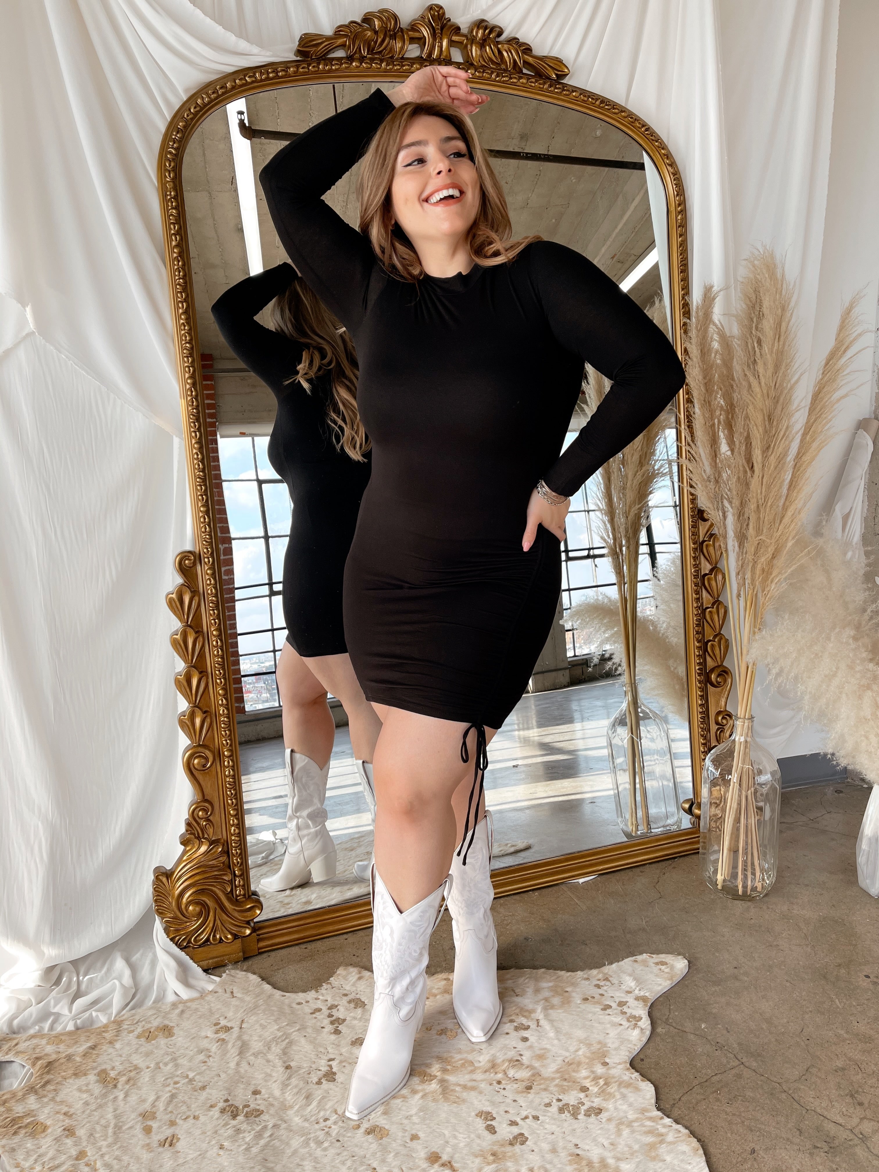 This long sleeve dress features a drawstring side seam, adjustable to the length of your choice. Super soft and comfortable with stretch! Pair it with your fav heels or dress it down with a plaid shacket and combat boots!