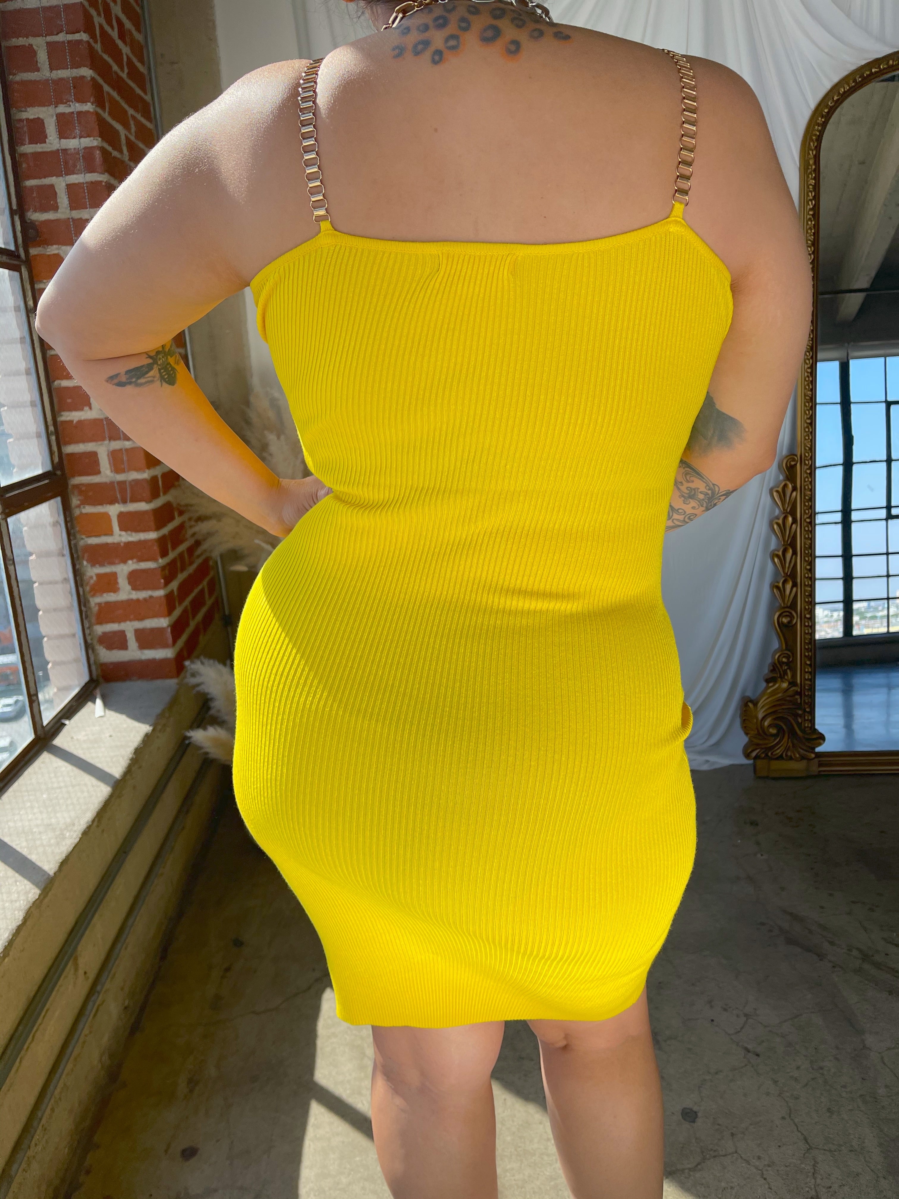 This midi dress features a light weight ribbed knit fabric and gold straps. Offers a lot of stretch and can be effortlessly styled with sneakers or heels. A must have for summer!