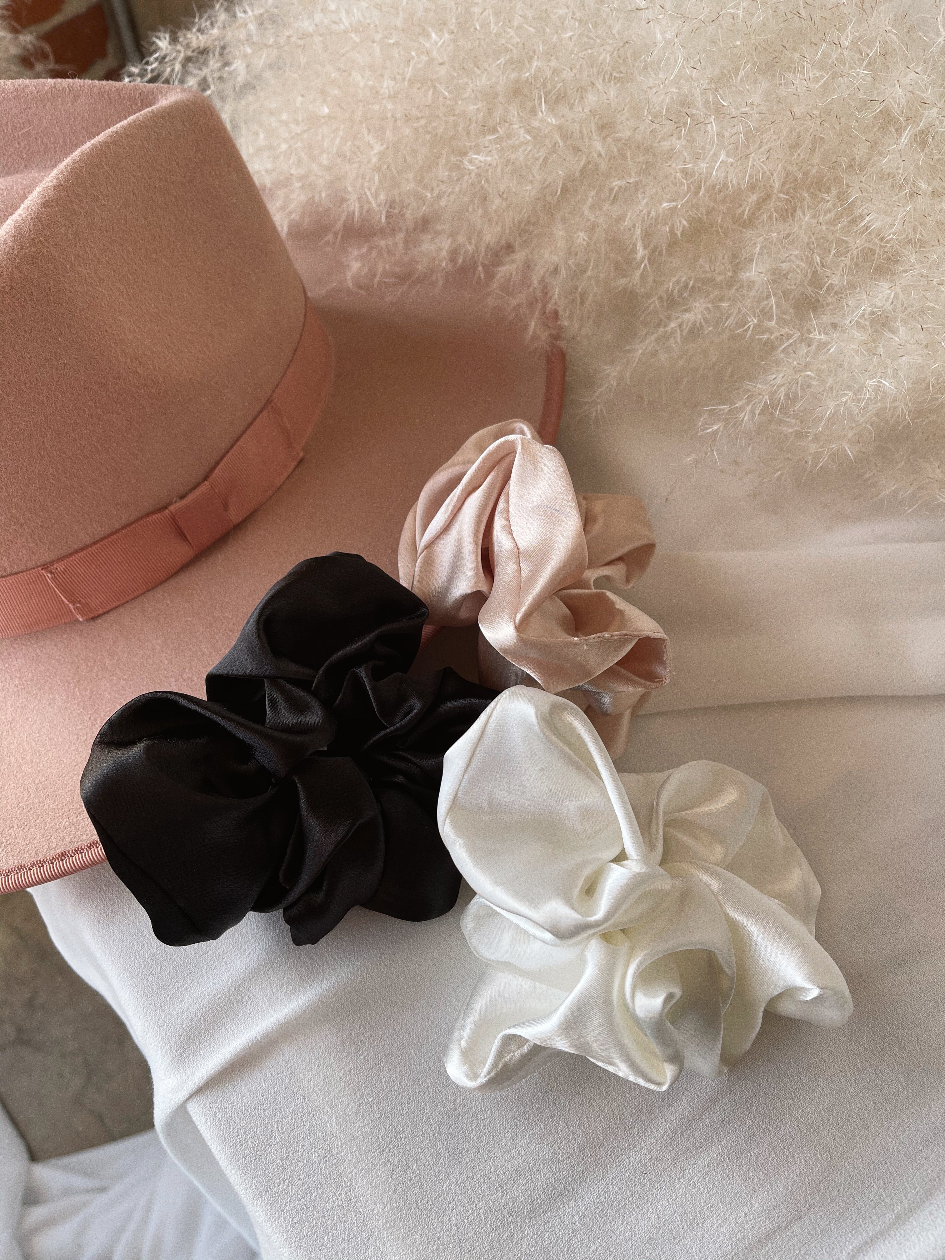 Three piece satin scrunchies set, in black, tan and white. Perfect for any hairstyle, we personally love them with half up styles on ponytails.