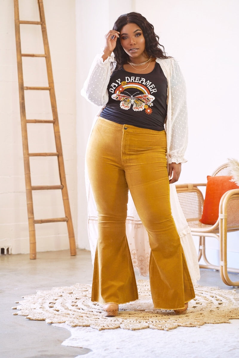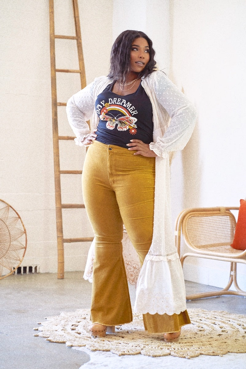 Our very favorite, WINONA Duster. A sheer kimono featuring allover scalloped hem and a polka dot embroidery, long trumpet sleeves that gather at wrist and a tie option in front. If you're between sizes, size up. Layer over any outfit for the perfect finish!