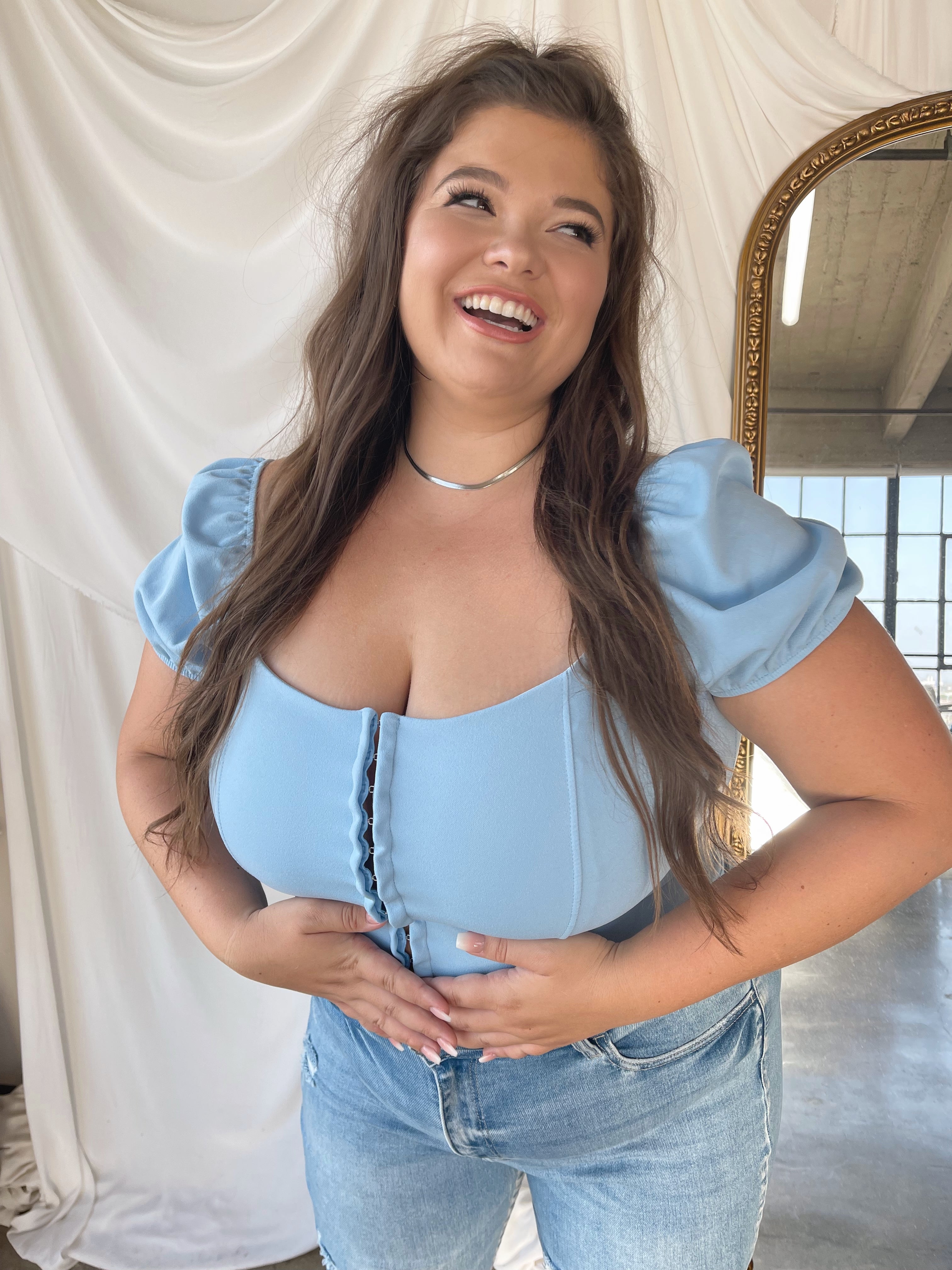 Our favorite style of top is back! The ADDY features a hook eye closure and puffy sleeves with some stretch. Pair it with jeans or a floral skirt.