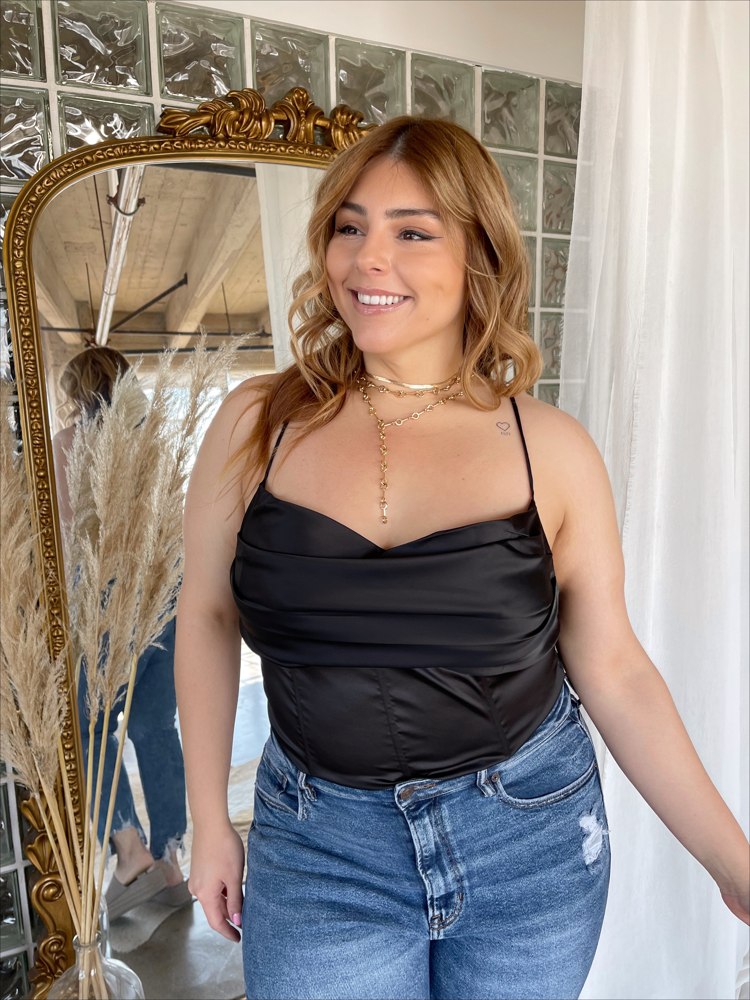 We're ready for Summer in the BARBIE Crop Top. Features an adjustable tie and a cowl neck design. Mild boning with a coset detail. No stretch, but room to adjust in the back. Pair it with your fav jeans and strappy heels!