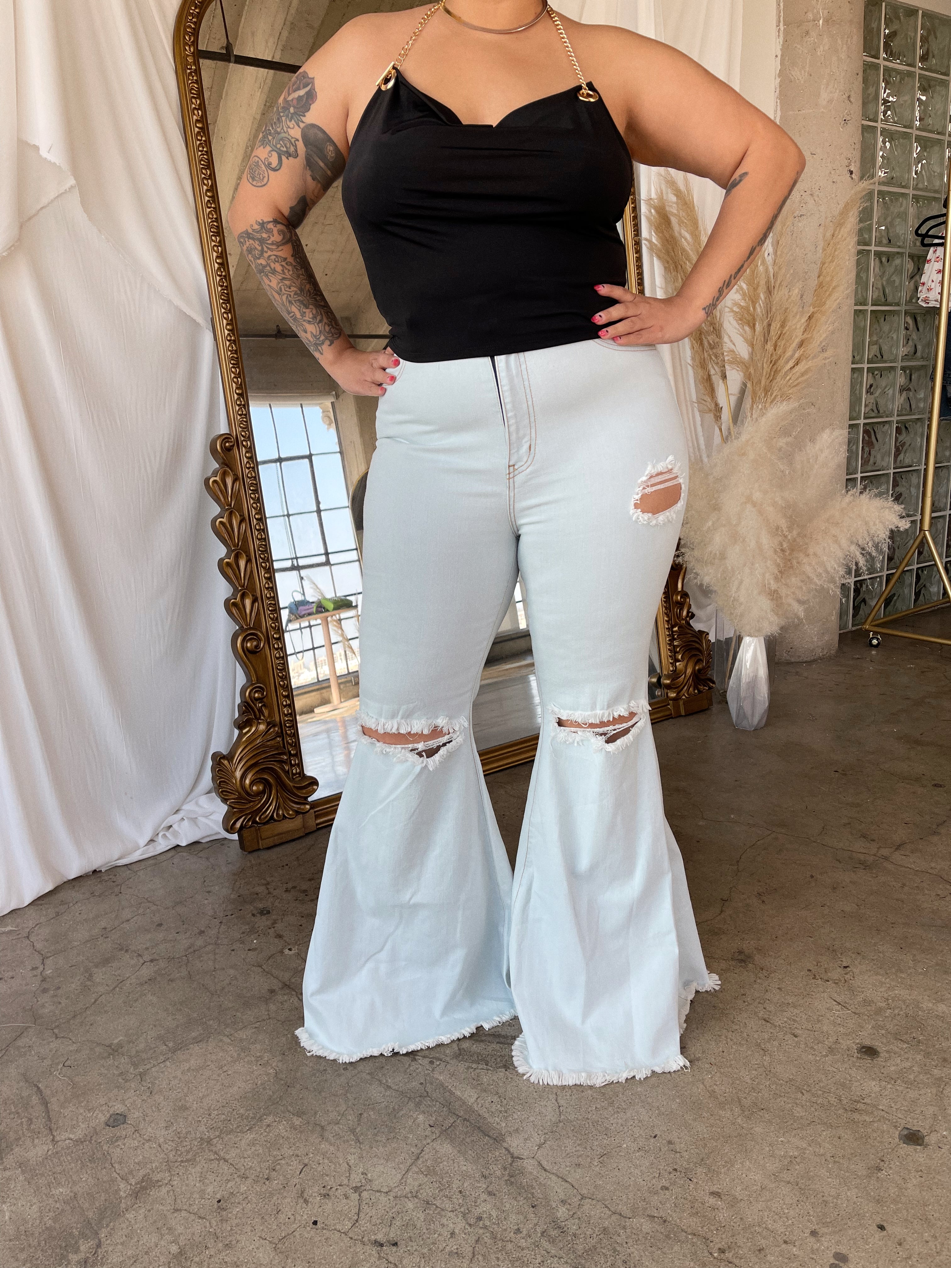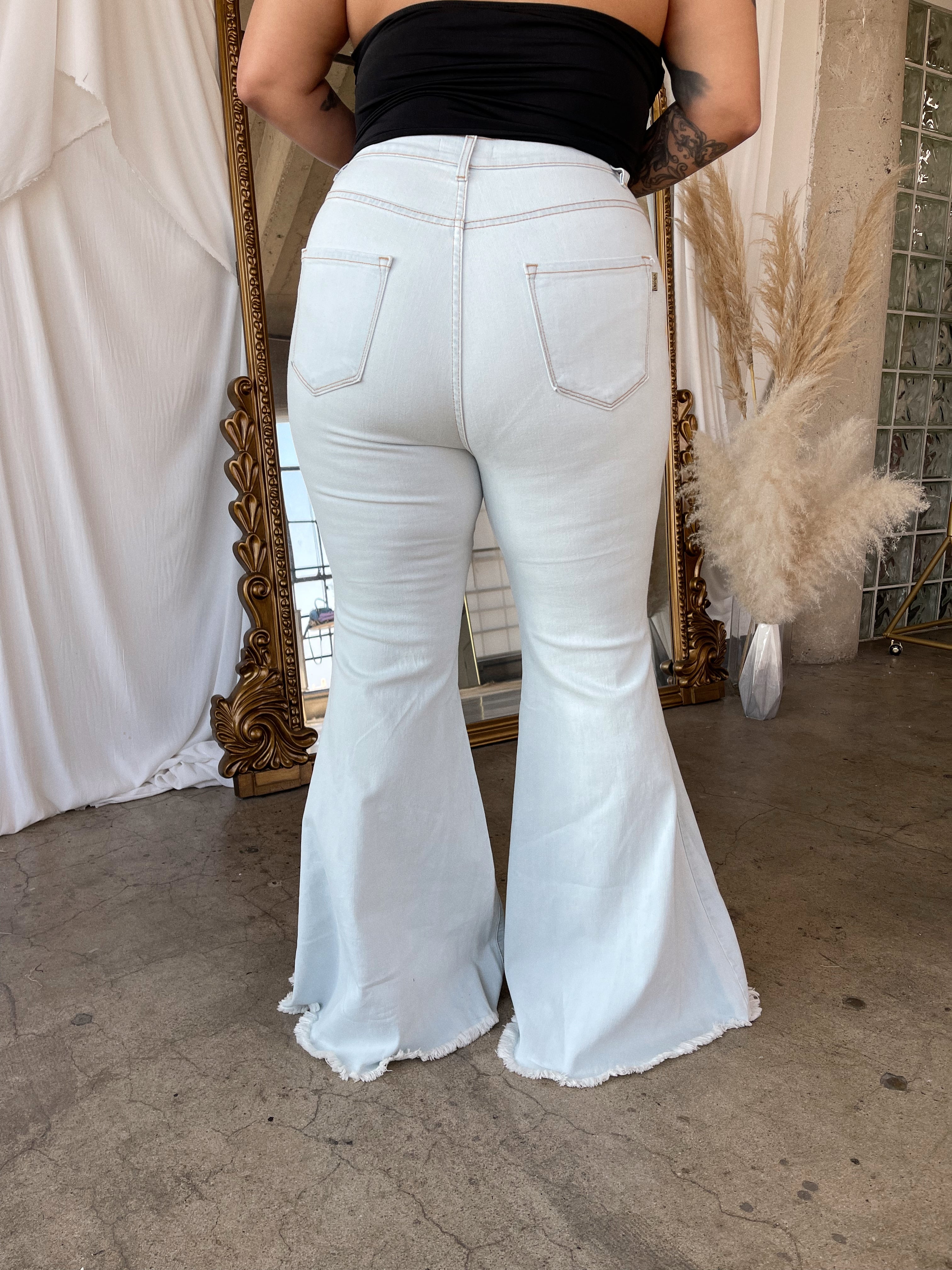 Your new favorite jeans, the CHERIE flares feature an exaggerated flare with a distressed design. Faux front pockets and a frayed hem with a zip-fly closure. Wear them with your fav band tee or dress it up with a top!