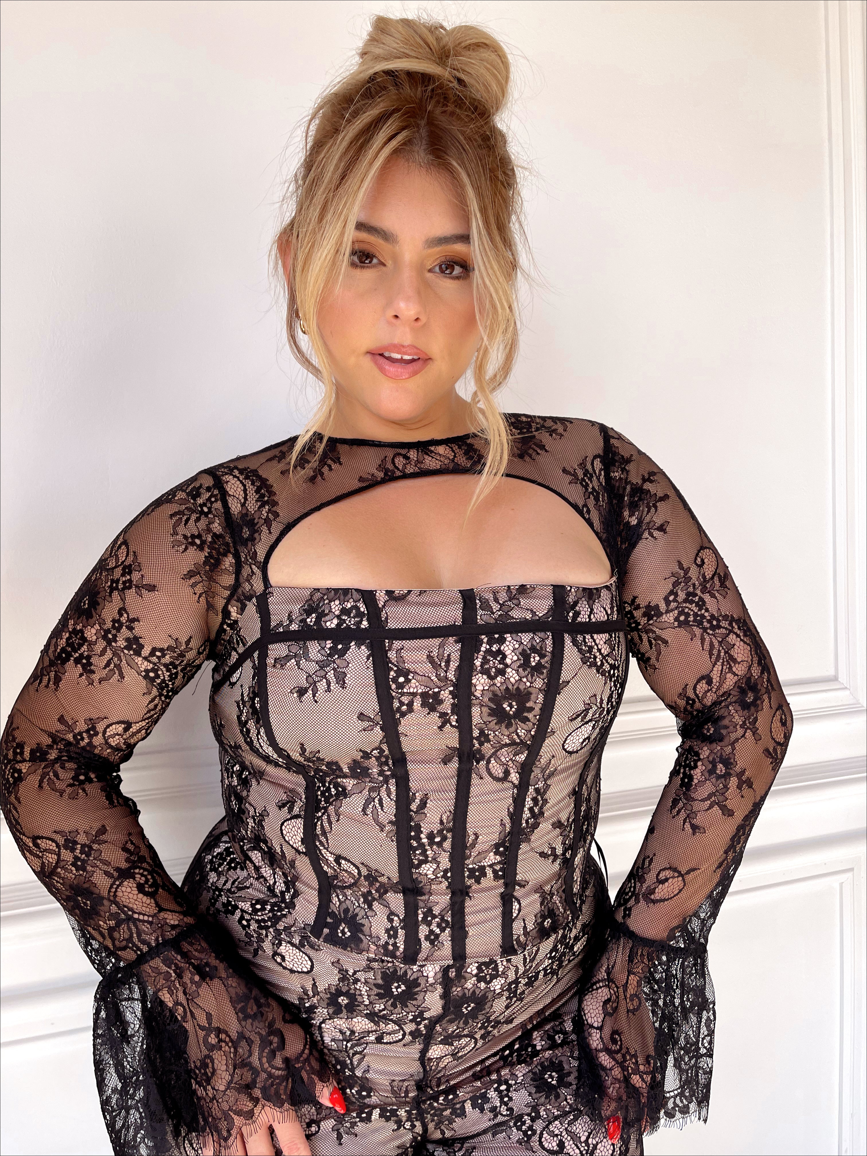 Make a statement in the the DELPHINE lace set. The top features long lace bell sleeves, with a corset style top. Open back design, zipper closure. High waisted pants, fully lined. Style together or separate, if you are between sizes size up. No stretch.