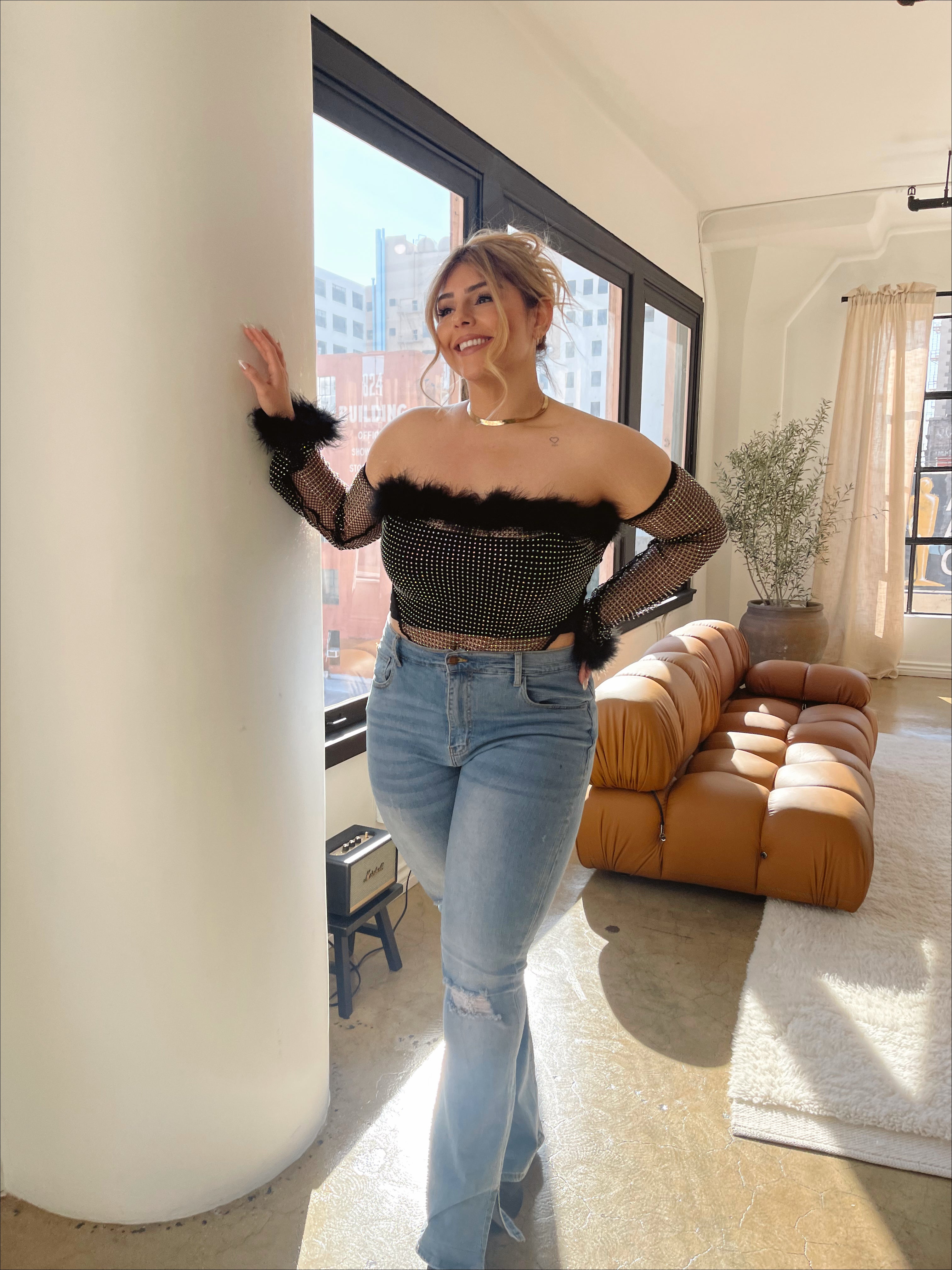 The ENCHANTED rhinestone bodysuit features a feather trim on the sleeves. Completely sheer, we paired it with a cami but can be styled various ways. Cami not included. Very stretchy. Pair with your fav jeans or make this your perfect festival fit!