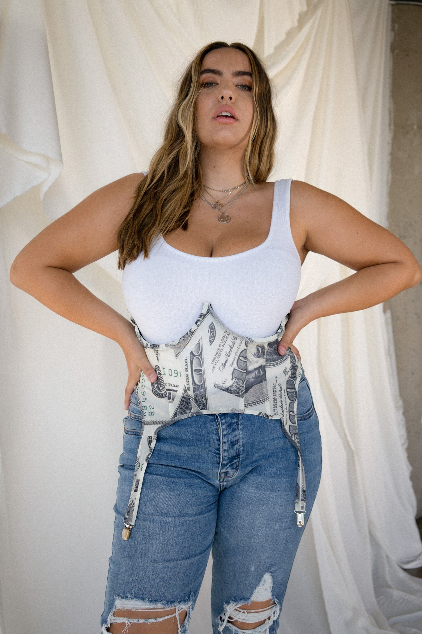 The LITA Under Bust Corset is strapless and features underwire, back zipper closure and stocking clips. The mesh sheer material also has mild boning for the perfect fit! Style it with a black blazer and your favorite jeans or leather pants for the perfect OOTD. (White top not included)