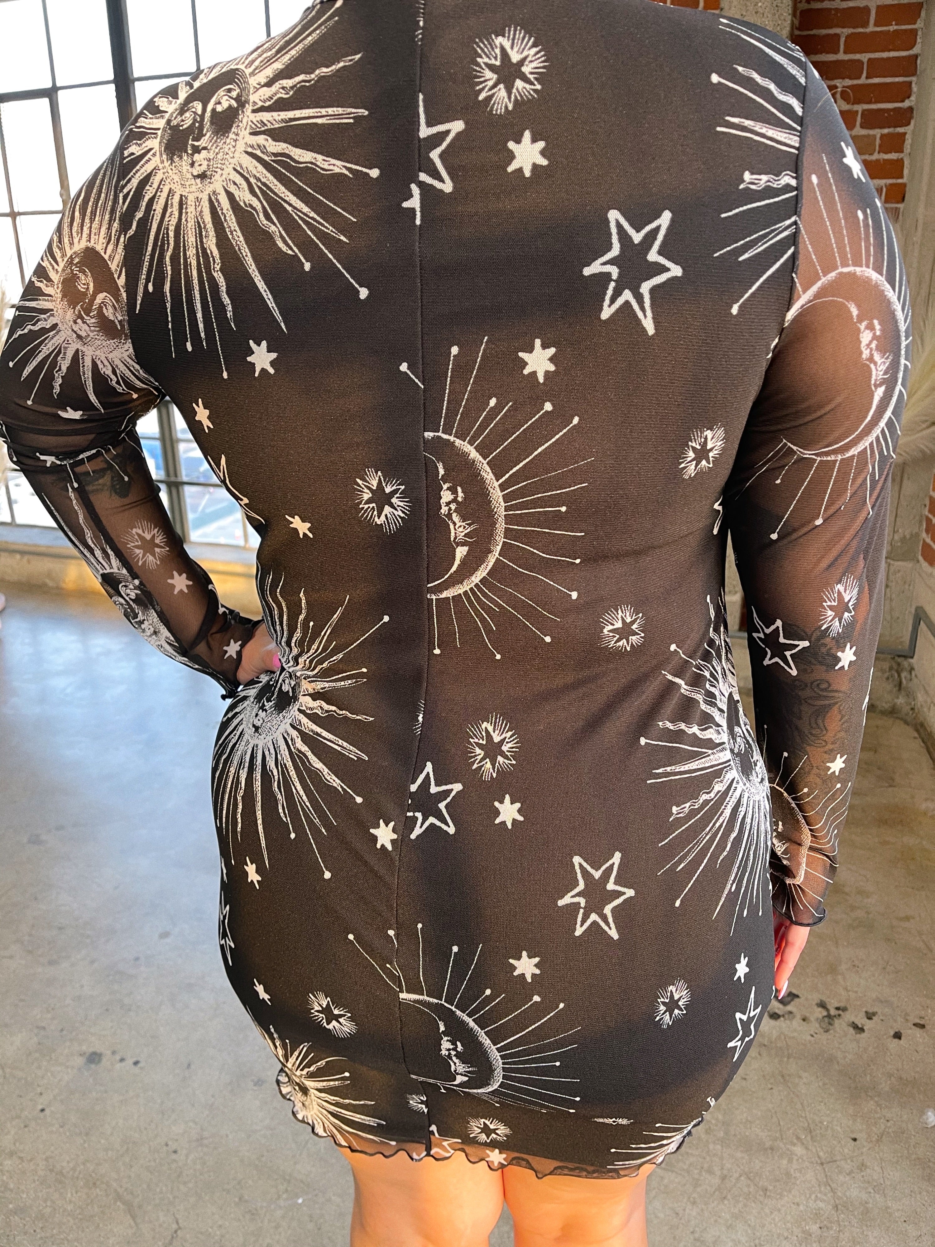 STARRY EYED and loving this print! This mini dress features a Celestial print and long sheer sleeves. Fully lined, the edges have a tiny ruffle for the perfect detail. Pair it with your fav booties or converse, either way it'll have them asking " What's your sign?"