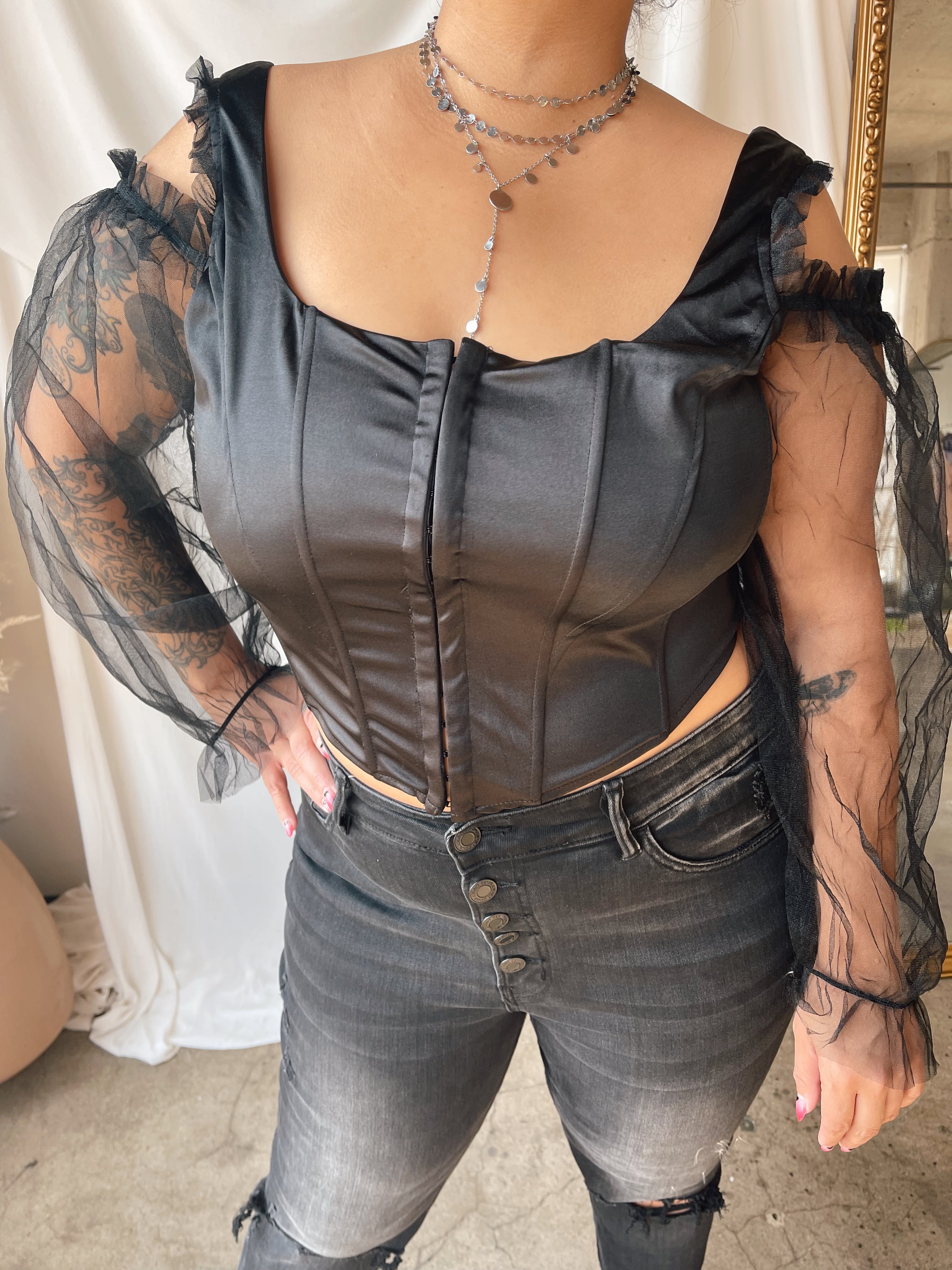 VICTORIA Black Satin Cold Shoulder Corset Top