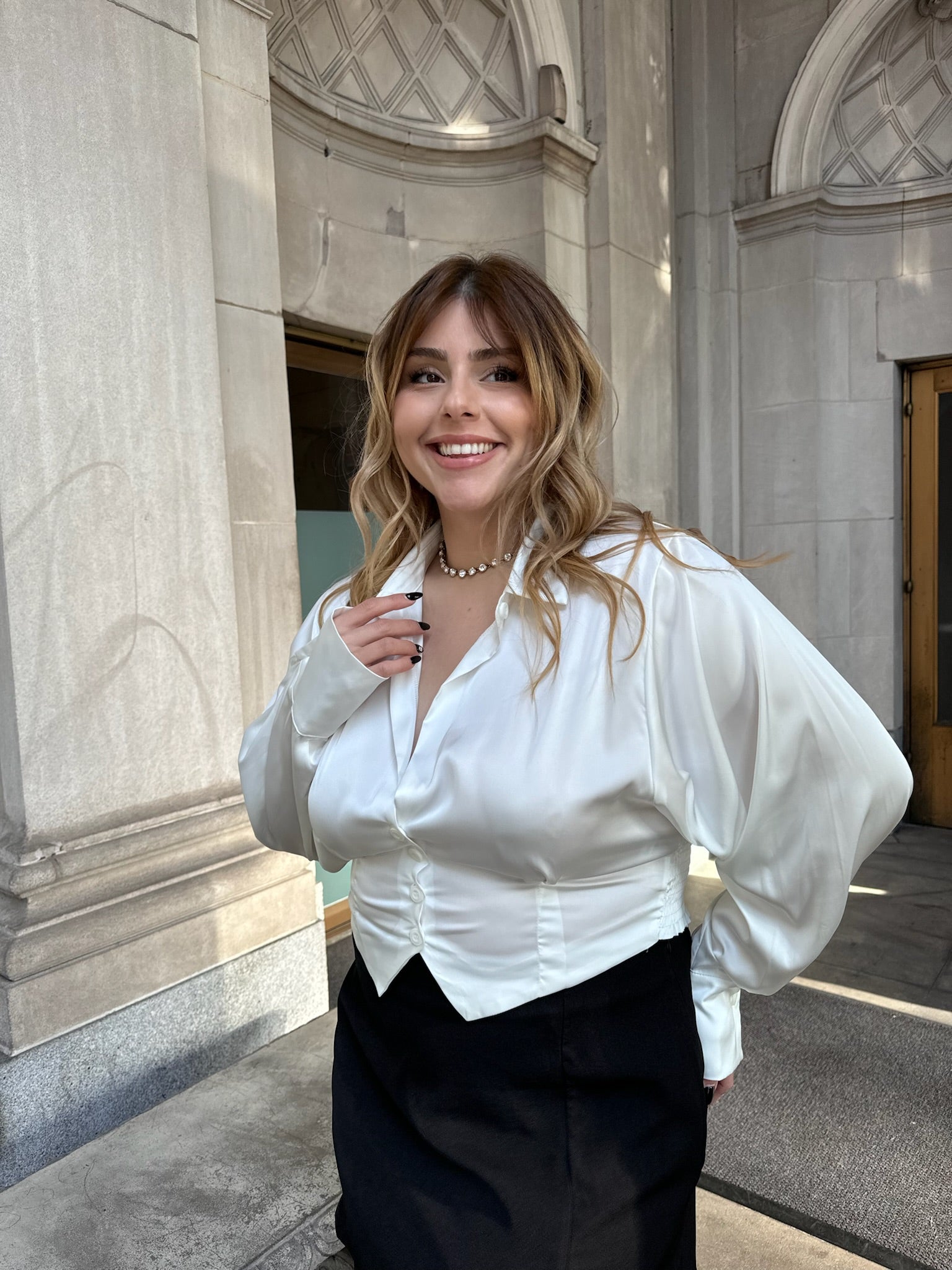 Dress to impress in our VIVIENNE Satin Cropped Blouse. Show off your style with a low neckline and balloon sleeves, while the ruching on the sides adds flattering definition. A button closure completes the look.