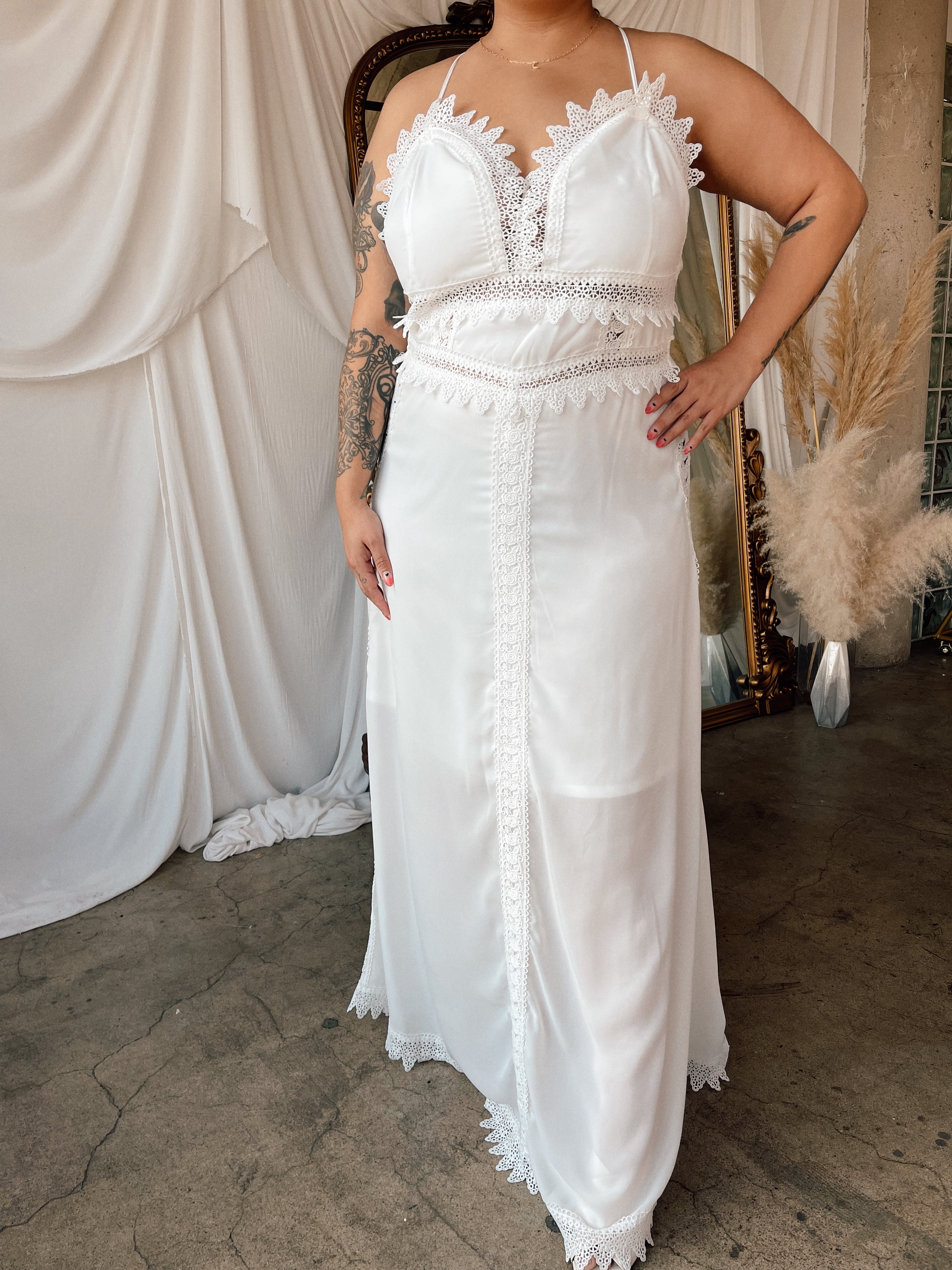 Lightweight woven fabric with Crochet Lace Trim, the WINSLET is the perfect dress for your next day or evening adventure. Open back design with zip up closure with clasp, adjustable tie straps, built in lining and Crochet Lace Trim design throughout.